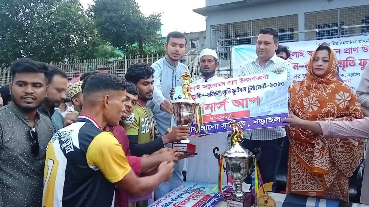 নড়াইলে জুলাই অভ্যুত্থানে প্রাণ উৎসর্গকারী শহিদ সালাউদ্দিন-রবিউল স্মৃতি ফুটবল টুর্নামেন্ট-২০২৫ এর ফাইনাল ম্যাচ ও পুরস্কার বিতরণী অনুষ্ঠিত হয়েছে। সামাজিক সংগঠন ঊষার আলো সূর্যসংঘ, নড়াইলের আয়োজনে শুক্রবার (২২ আগস্ট) বিকাল ৪ টায় শহরের বীরশ্রেষ্ঠ নূর মোহাম্মদ স্টেডিয়ামে এই ফাইনাল ম্যাচ অনুষ্ঠিত হয়। এতে রাইজিং স্টার ও দূর্গাপুর স্পোর্টিং ক্লাব নামে দুইটি দল অংশ নেয়। খেলায় দূর্গাপুর স্পোর্টিং ক্লাব ৫-০ গোলে রাইজিং স্টার ক্লাবকে পরাজিত করে চ্যাম্পিয়ন হওয়ার গৌরব অর্জন করে।