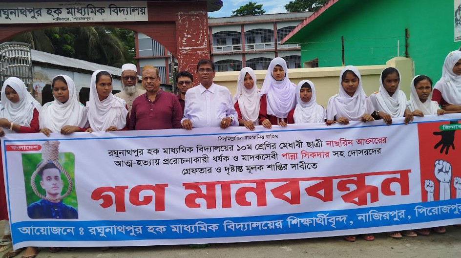 নাজিরপুরে স্কুলছাত্রীর আত্মহত্যা: অভিযুক্ত পান্না শিকদারের ফাঁসির দাবিতে মানববন্ধন