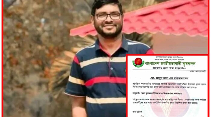 ঠাকুরগাঁও জেলার রাণীশংকৈল প্রেসক্লাবকে উড়িয়ে দিয়ে, সভাপতি কে পুলিশের দ্বারা গ্রেফতার করে, মোটরসাইকেল বেঁধে গোটা শহর ঘুরানোর হুমকি দাতা রানীশংকৈল উপজেলা কৃষকদলের সিনিয়র সহ-সভাপতি মাসুদ রানাকে বহিষ্কার করেছে জেলা কৃষক দল।