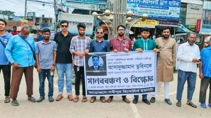 গাজীপুরে দৈনিক প্রতিদিনের কাগজ পত্রিকার জেলা প্রতিনিধি মরহুম আসাদুজ্জামান তুহিন হত্যার প্রতিবাদে আজ ৯ আগষ্ট শনিবার দুপুর ১২ টায়,সখিপুর রিপোর্টার্স ইউনিটির আয়োজনে মানববন্ধন ও বিক্ষোভ কর্মসূচী পালিত হয়। এতে বক্তব্য