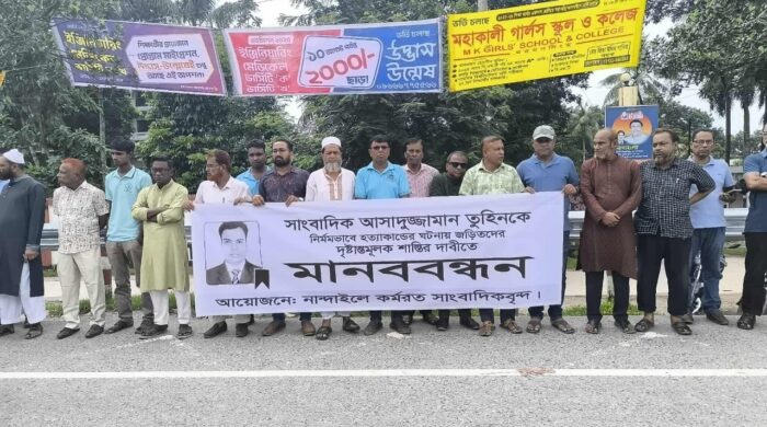 গাজীপুরের চান্দুরায় সাংবাদিক আসাদুজ্জামান তুহিনকে প্রকাশ্যে কুপিয়ে ও জবাই করে হত্যা করা হয়। এমন নৃশংস হত্যার বিচার চেয়ে এবং দৃষ্টান্তমূলক শাস্তির দাবিতে ময়মনসিংহের নান্দাইলে কর্মরত সাংবাদিকদের আয়োজনে শনিবার (৯ আগস্ট)