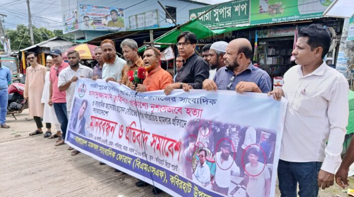 নোয়াখালীর কবিরহাটে গাজীপুরের দৈনিক প্রতিদিনের কাগজের সাংবাদিক আসাদুজ্জামান তুহিনকে নৃশংসভাবে হত্যার এবং সাংবাদিক আনোয়ার হোসেন সোহেলের উপর সন্ত্রাসী হামলার প্রতিবাদে মানববন্ধন ও প্রতিবাদ সমাবেশ অনুষ্ঠিত হয়েছে। শনিবার (৯ আগস্ট ২০২৫)