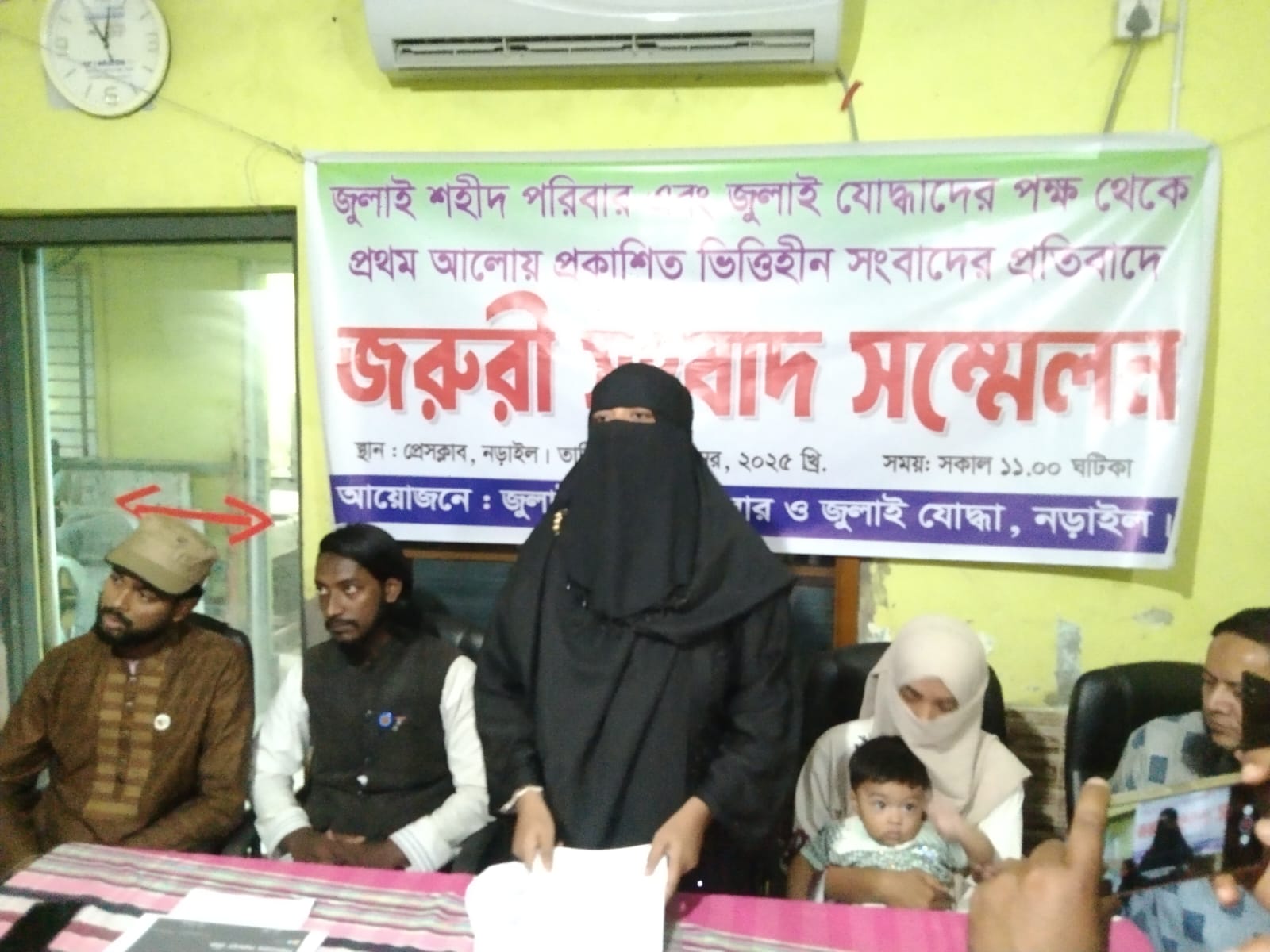 প্রকাশিত সংবাদের প্রতিবাদে নড়াইলে জুলাই শহীদ পরিবার ও ‘জুলাই যোদ্ধা’দের সংবাদ সম্মেলন