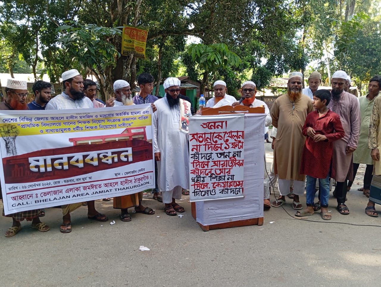 শুক্রবার ২৬-শে সেপ্টেম্বর জুমার নামাজের পরে ঠাকুরগাঁও সদর উপজেলার ভেলাজান বাজারে "ভেলাজান এলাকা জমঈয়ত আহলে হাদীস ঠাকুরগাঁও" এর উদ্যোগে উক্ত মানববন্ধনটি অনুষ্ঠিত হয়।
