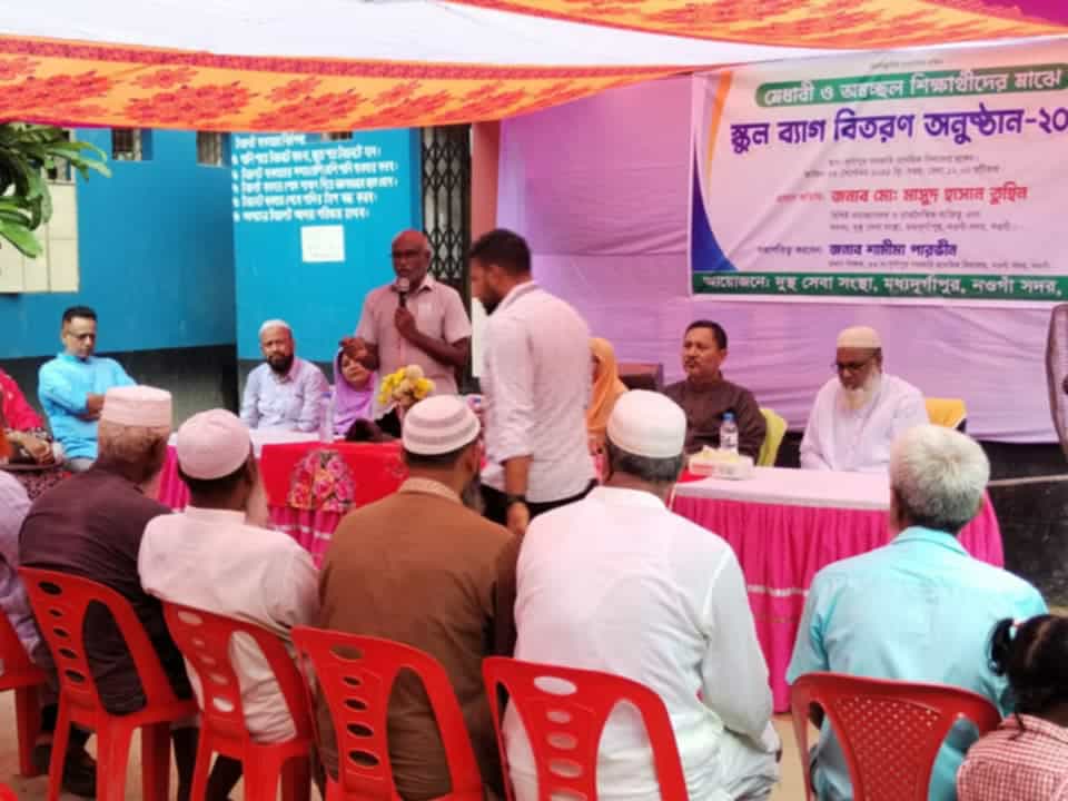 নওগাঁ দূর্গাপুর সরকারি প্রাথমিক বিদ্যালয়ে মেধাবী ও অস্বচ্ছল শিক্ষার্থীদের মাঝে স্কুল ব্যাগ বিতরণ