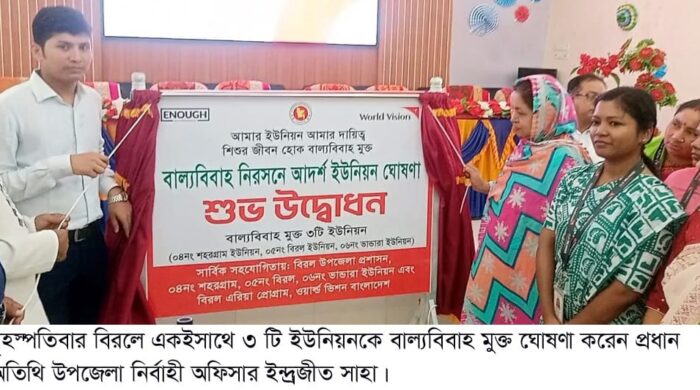 দিনাজপুরের বিরলে গ্রাম উন্নয়ন কমিটি, শিশু ও যুব ফোরাম কর্তৃক আয়োজিত এবং বিরল এপি, ওয়ার্ল্ড ভিশন এর সহযোগিতায় বাল্য বিবাহ নিরসনে আদর্শ ইউনিয়ন ঘোষনা-২০২৫ ও একইসাথে ৩ টি ইউনিয়নকে বাল্যবিবাহ