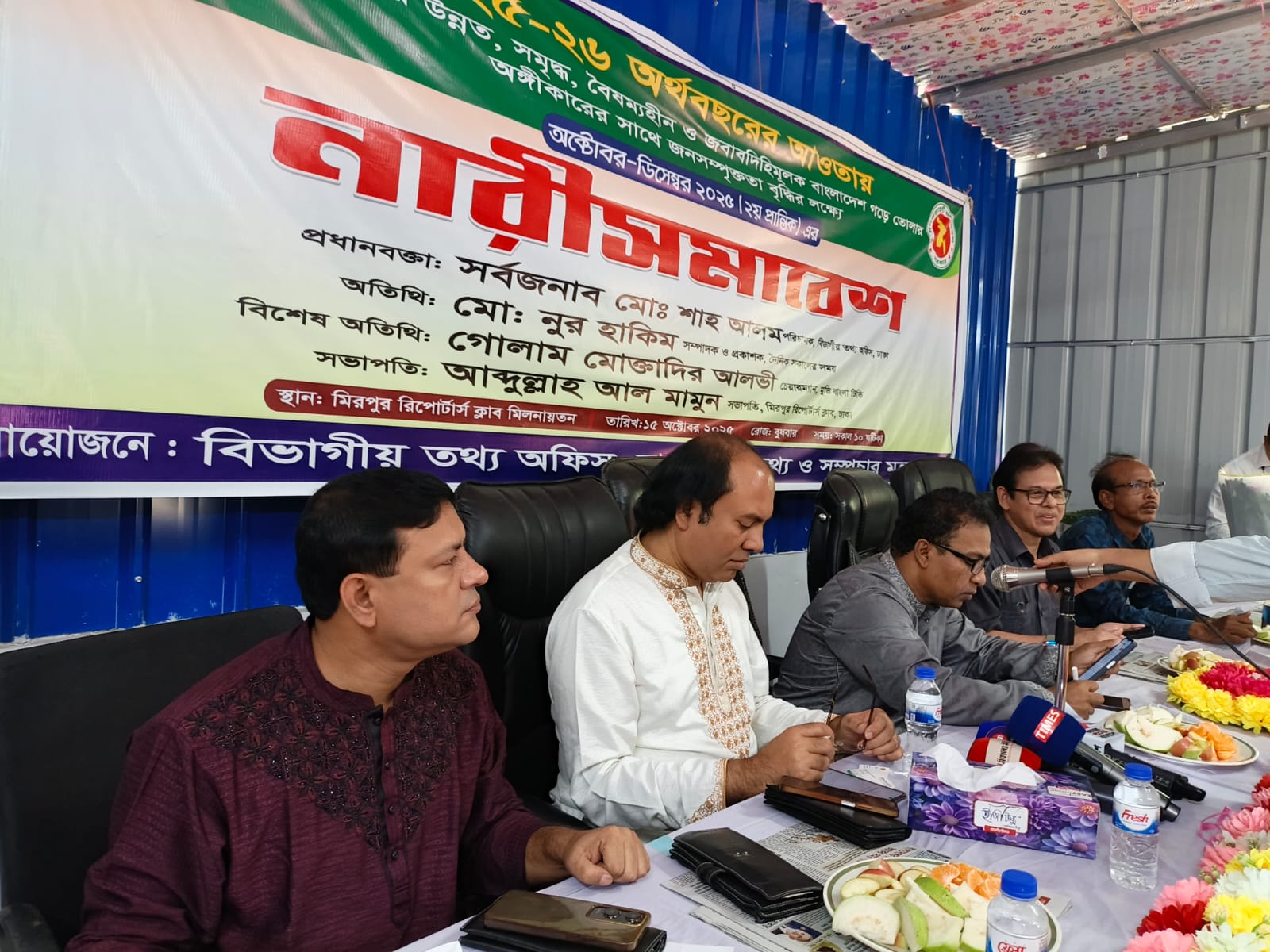 মিরপুর রিপোর্টার্স ক্লাবে তথ্য ও সম্প্রচার মন্ত্রনালয়ের আয়োজনে আজ ১৫ অক্টোবর ২০২৫ ইং তারিখে তারুণ্য নির্ভর উন্নত সমৃদ্ধ বাংলাদেশ বিনির্মাণে যৌতুক, বাল্যবিবাহ, ইভটিজিং, মাদকসহ বিভিন্ন বিষয়ের উপর সচেতনতামূলক নারী সমাবেশ অনুষ্ঠিত হয়। অনুষ্ঠানটি ভার্চুয়ালী উদ্বোধন করেন - তথ্য ও সম্প্রচার মন্ত্রনালয়ের মহাপরিচালক - মোঃ আব্দুল জলিল। অনুষ্ঠানে প্রধান বক্তা হিসেবে উপস্থিত ছিলেন জনাব, মোঃ শাহ আলম (বিসিএস তথ্য, উপসচিব পদমর্যাদার পরিচালক, তথ্য ও সম্প্রচার মন্ত্রণালয়)