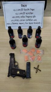 খুলনা মহানগর গোয়েন্দা বিভাগের পুলিশ পরিদর্শক জনাব তৈমুর ইসলামের নেতৃত্বে এসআই (নিঃ)/মোঃ সেলিম হোসেন, এসআই (নিঃ)/বিধান চন্দ্র রায় সহ ডিবি’র একটি শক্তিশালী টিম ১৭/১০/২০২৫ খ্রিঃ রাত ১২টা৩০মিনিট থেকে০২,৩০ঘটিকার সময় গোপন সংবাদের ভিত্তিতে অভিযান চালিয়ে দৌলতপুর থানাধীন পাবলা খানপাড়া ধৃত আসামী মোঃ রহমান গাজী এর বসতঘরের পশ্চিম পাশের রুমের মধ্য হতে ০১। মোঃ রহমান গাজী (২৬), পিতা-মৃত নূর ইসলাম গাজী, মাতা-মৃত জামিলা বেগম, সাং-পাবলা খানপাড়া, থানা-দৌলতপুর, মহানগর খুলনা এবং ০২। মোঃ আবুল কালাম আজাদ (২৭), পিতা-মোঃ আব্দুস সাত্তার, মাতা-মোসাঃ রাশেদা বেগম, সাং-দেয়ানা মোল্লাপাড়া, থানা-দৌলতপুর, মহানগর খুলনাদের’কে ০১ (এক)টি বিদেশি পিস্তল, ০১ (এক)টি ম্যাগাজিন, ০৪ (চার) রাউন্ড পিস্তলের তাজা গুলি, ০৭ (সাত) বোতল ফেন্সিডিল এবং ৩৫০ (তিনশত পঞ্চাশ) পিস ইয়াবা ট্যাবলেট সহ গ্রেফতার করে। উক্ত আসামীদের প্রাথমিক জিজ্ঞাসাবাদ এবং সিডিএমএস পর্যালোচনায় দেখা যায় যে, আসামী ০১। মোঃ রহমান গাজী (২৬) এর বিরুদ্ধে কেএমপি এর দৌলতপুর থানার এফআইআর নং-০৭, তারিখ-০৯ এপ্রিল, ২০১৩; ধারা-৪৪৭/৩২৩/৪২৭/৩৭৯/৫০৬ পেনাল কোড-১৮৬০; এবং গ্রেফতারকৃত আসামী ০২। মোঃ আবুল কালাম আজাদ (২৭) এর বিরুদ্ধে কেএমপি এর দৌলতপুর থানার এফআইআর নং-০১, তারিখ-০১ মার্চ, ২০১৭; ধারা-১৯(১) এর ৯(ক) ১৯৯০ সালের মাদক দ্রব্য নিয়ন্ত্রণ আইন; রহিয়াছে। তাদের বিরুদ্ধে দৌলতপুর থানায় মামলা দায়ের করা হয়েছে।