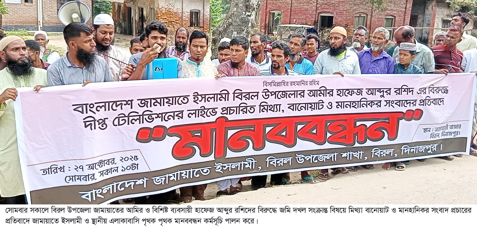 বিরল উপজেলা জামায়াতের আমির ও বিশিষ্ট ব্যবসায়ী হাফেজ আব্দুর রশিদের বিরুদ্ধে জমি দখল সংক্রান্ত বিষয়ে মিথ্যা বানোয়াট ও মানহানিকর সংবাদ প্রচারের প্রতিবাদে জামায়াতে ইসলামী ও স্থানীয় এলাকাবাসি মানববন্ধন কর্মসূচি পালন করেছে।