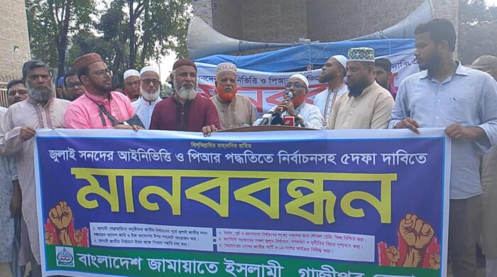 জাতীয় নির্বাচনে জুলাই সনদ এর আইন ভিত্তি ও পিআর পদ্ধতি (প্রোপোরশনাল রিপ্রেজেন্টেশন) চালুসহ কেন্দ্র ঘোষিত ৫-দফা দাবিতে গাজীপুরের শ্রীপুরে মানববন্ধন করেছে বাংলাদেশ জামায়াতে ইসলামী। বুধবার ( ১৫ অক্টোবর ) দুপুরে
