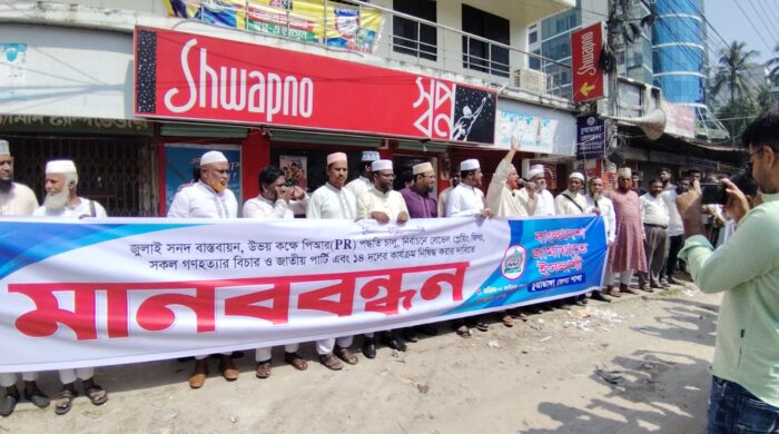 জুলাই সনদের আইনগত ভিত্তি এবং সংখ্যানুপাতিক প্রতিনিধিত্ব (পিআর) পদ্ধতিসহ পাঁচ দফা দাবিতে চুয়াডাঙ্গায় পৃথকভাবে মানববন্ধন করেছে বাংলাদেশ জামায়াতে ইসলামী এবং ইসলামী আন্দোলন বাংলাদেশ। বুধবার ১৫ অক্টোবর তবে বুধবার সকাল সাড়ে