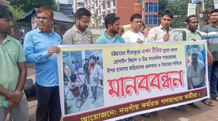 চট্টগ্রামের সীতাকুন্ডে জঙ্গল সলিমপুর এলাকায় সংবাদ সংগ্রহ করতে যাওয়ায় এখন টেলিভিশনের ব্যুরো প্রধান হোসাইন জিয়াদ ও চিত্র সাংবাদিক পারভেজ রহমান এর ওপর সন্ত্রাসি হামলার প্রতিবাদ ও আসামীদের দ্রুত গ্রেফতারের দাবীতে