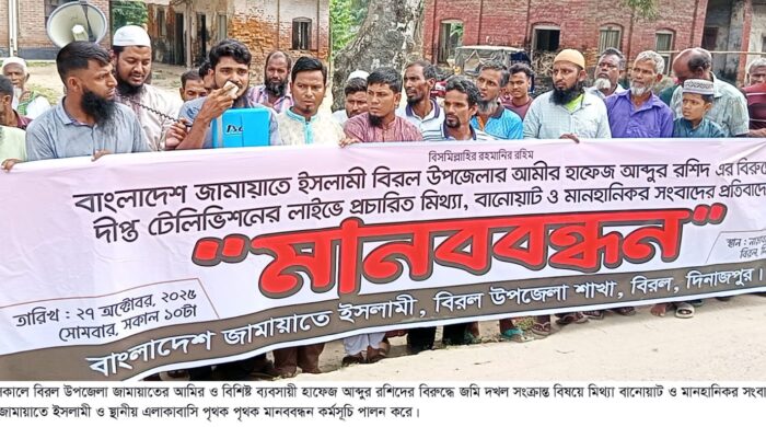 বিরল উপজেলা জামায়াতের আমির ও বিশিষ্ট ব্যবসায়ী হাফেজ আব্দুর রশিদের বিরুদ্ধে জমি দখল সংক্রান্ত বিষয়ে মিথ্যা বানোয়াট ও মানহানিকর সংবাদ প্রচারের প্রতিবাদে জামায়াতে ইসলামী ও স্থানীয় এলাকাবাসি মানববন্ধন কর্মসূচি পালন