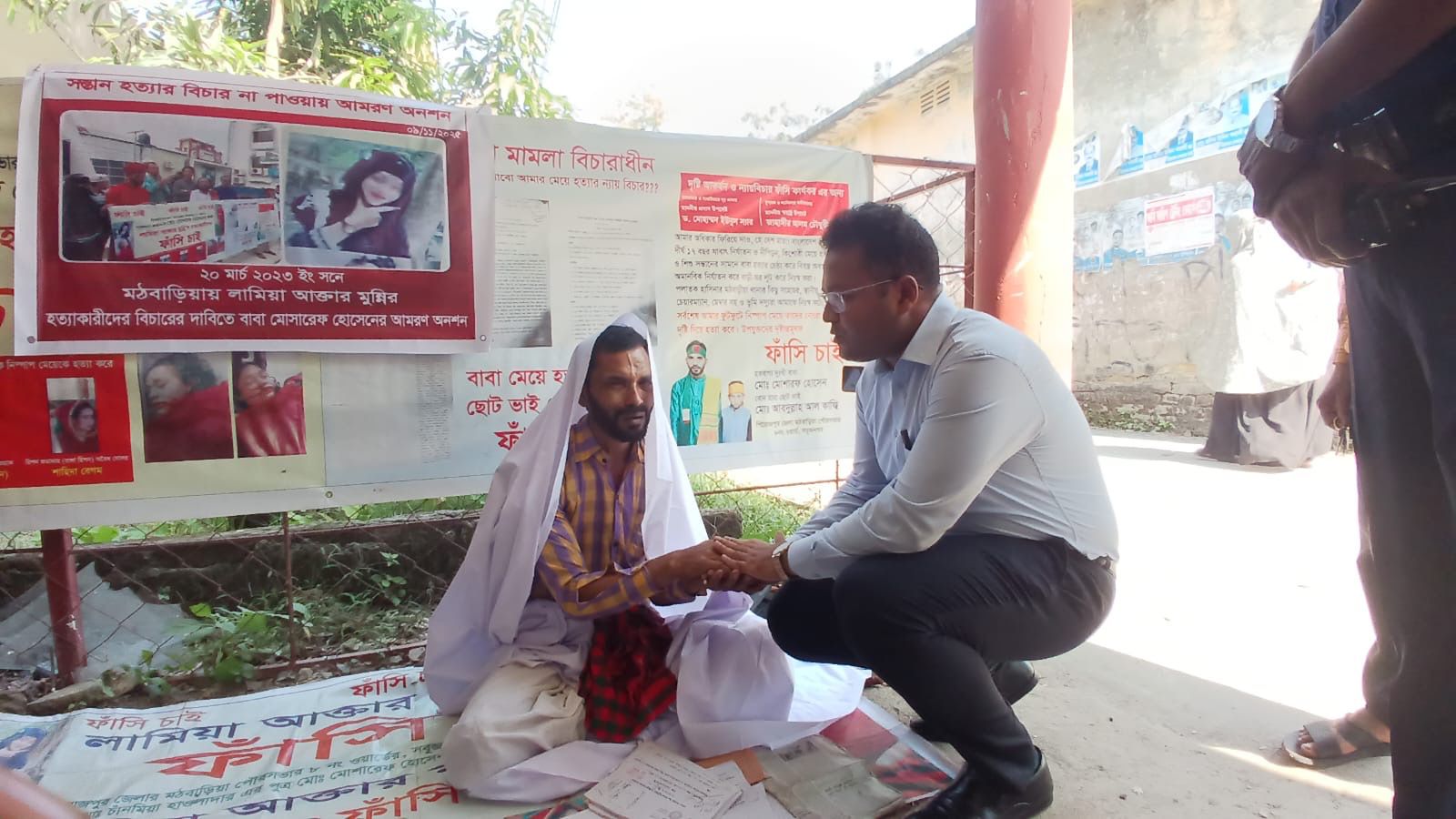 পিরোজপুরের মঠবাড়িয়ায় নিজ কন্যা লামিয়া আক্তার মুন্নি (১৫) এর হত্যাকারীদের দৃষ্টান্ত মূলক শাস্তির দাবিতে অনশনে বসছেন মোশারফ হোসেন হাওলাদার। ৯ নভেম্বর রোববার সকাল ১১ টায় মঠবাড়িয়া সিনিয়র জুডিসিয়াল ম্যাজিস্ট্রেট আদালতের সামনে কাফনের কাপড় গায়ে জড়িয়ে অনশনে বসেন তিনি। দুপুর দুইটার দিকে মঠবাড়িয়া উপজেলা নির্বাহী কর্মকর্তার প্রতিনিধি হিসেবে সহকারী কমিশনার (ভূমি) মোহাম্মদ রাইসুল ইসলাম আইনগত সর্বাত্মক সহযোগিতার আশ্বাস দিয়ে জুস পান করিয়ে মোশারফ হোসেনের অনশন ভাঙ্গান।