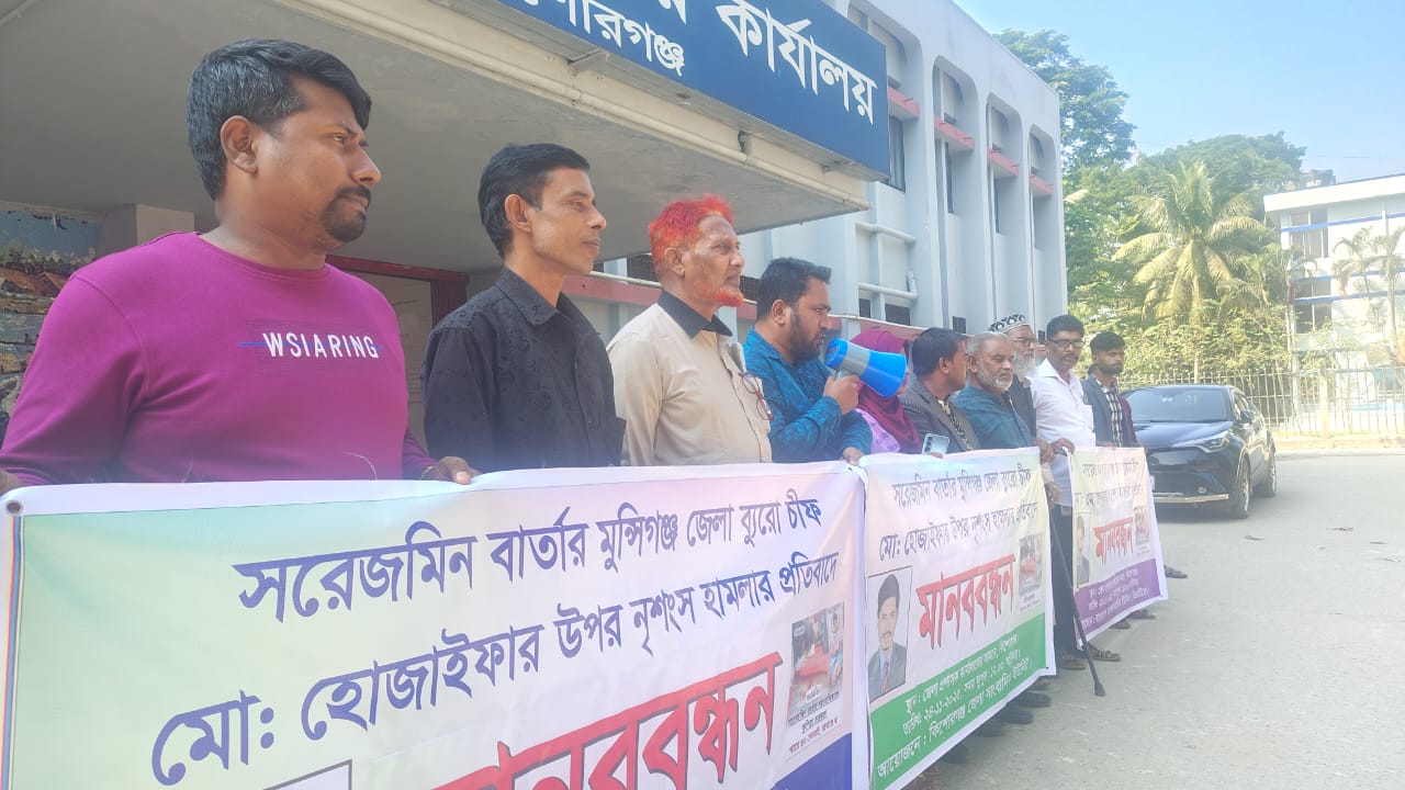 মুন্সিগঞ্জের সাংবাদিক হুজাইফার উপর সন্ত্রাসীদের হামলার প্রতিবাদে মানববন্ধন করা হয়েছে।