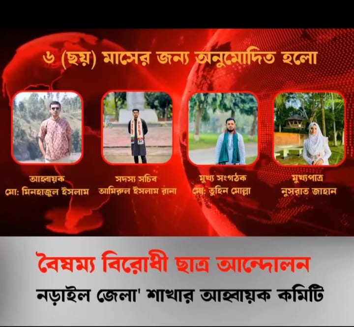 বৈষম্যবিরোধী ছাত্র আন্দোলনের নড়াইল জেলা শাখার নতুন আহ্বায়ক কমিটি গঠন করা হয়েছে। বুধবার (২৬ নভেম্বর) দিবাগত রাতে সংগঠনটির ভেরিভাইড ফেসবুক পেইজে ১৫১ সদস্যের এ কমিটি প্রকাশ করা হয়। ছয়মাস মেয়াদি এ কমিটির অনুমোদন দিয়েছেন বৈষম্যবিরোধী ছাত্র আন্দোলনের কেন্দ্রীয় কমিটির সভাপতি রিফাত রশীদ, সাংগঠনিক সম্পাদক মুঈনুল ইসলাম ও মুখ্য সমন্বয়ক হাসিব আল ইসলাম।