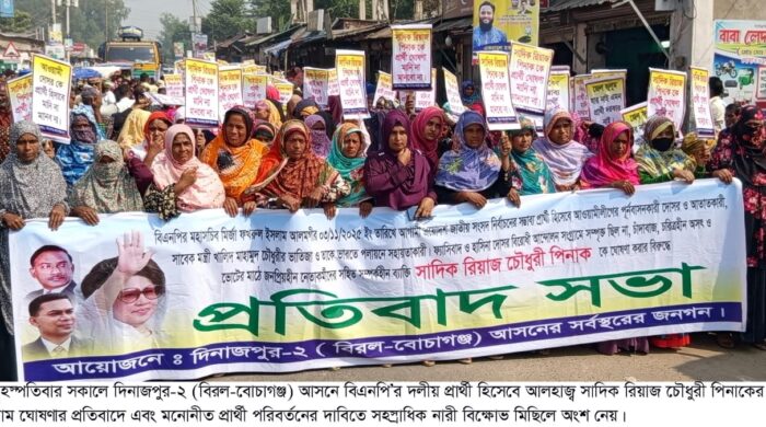 দিনাজপুর-২ (বিরল-বোচাগঞ্জ) আসনে বিএনপি’র দলীয় প্রার্থী হিসেবে আলহাজ্ব সাদিক রিয়াজ চৌধুরী পিনাকের নাম ঘোষণার প্রতিবাদে এবং মনোনীত প্রার্থী পরিবর্তনের দাবিতে দুই উপজেলার বিএনপি ও অংগ সহযোগী সংগঠনসমূহের নেতৃবৃন্দসহ নারীদে প্রতিবাদ