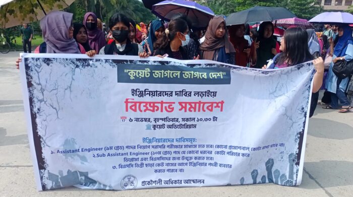 খুলনা প্রকৌশল ও প্রযুক্তি বিশ্ববিদ্যালয়ে ৬ ই নভেম্বর সকাল ১১টাই তিন দফা দাবি আদায়ের লক্ষ্যে ছাত্রছাত্রীরা বিক্ষোভ মিছিল সহ কিছু সময়ের জন্য খুলনা যশোর রোড ব্লক করে। এসিস্ট্যান্ট ইঞ্জিনীয়ার( ৯ম read more