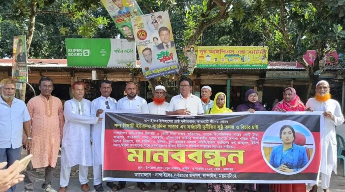 নান্দাইলের সাবেক উপজেলার নির্বাহী কর্মকর্তা (ইউএনও) সারমিনা সাত্তারের বিরুদ্ধে ৩ কোটি টাকা দুর্নীতির অভিযোগ তদন্ত ও বিচারের দাবিতে মানববন্ধন করেছে উপজেলার ইউপি সদস্যরা। মঙ্গলবার (৪ নভেম্বর) দুপুর ১২টায় ময়মনসিংহ-কিশোরগঞ্জ মহাসড়কের