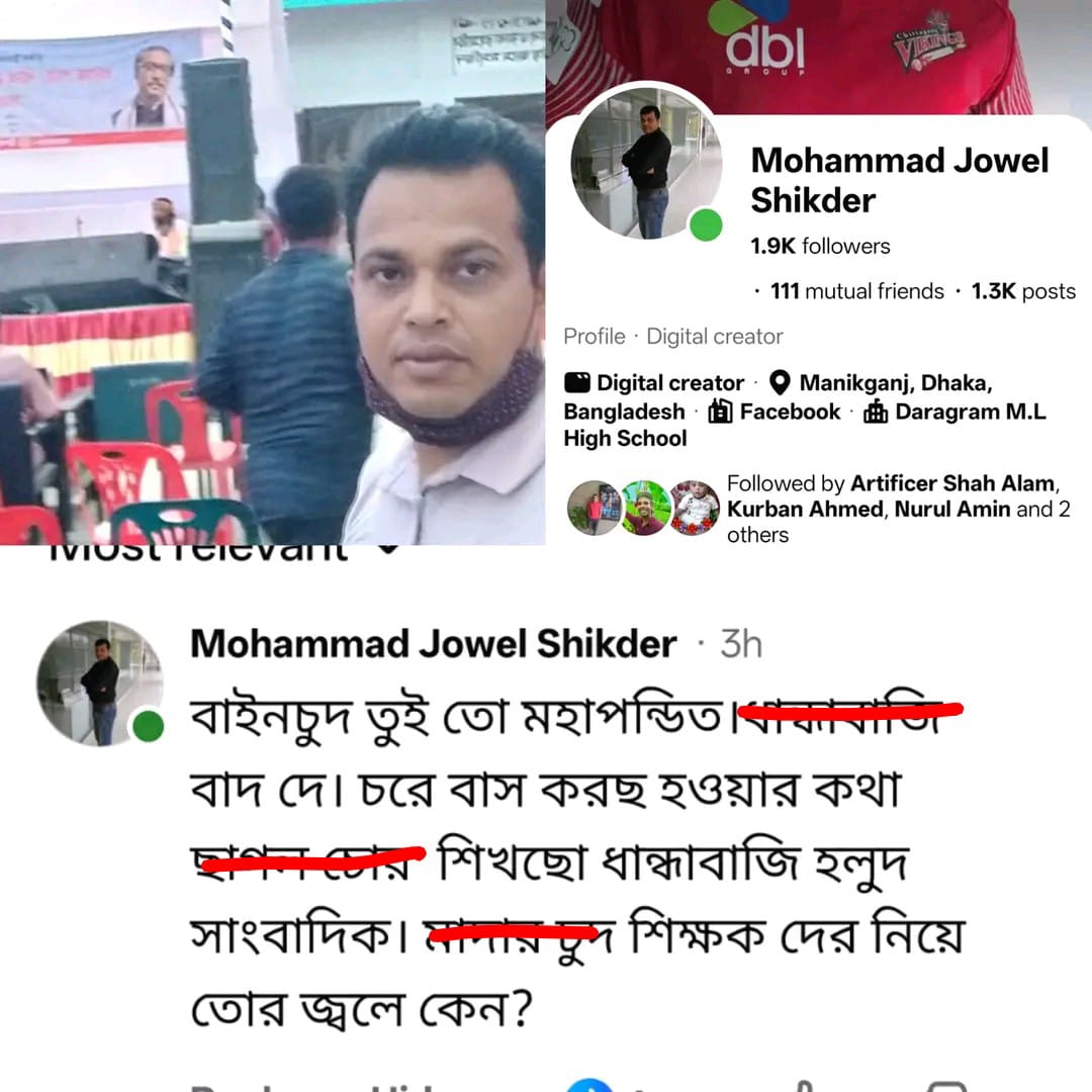 মানিকগঞ্জের সাটুরিয়া উপজেলার বেংরোয়া সরকারি প্রাথমিক বিদ্যালয়ের শিক্ষক মোহাম্মদ জুয়েল শিকদার এর বিরুদ্ধে এক গণমাধ্যমকর্মীকে অশ্রাব্য ভাষায় গালিগালাজ ও ফোনে হুমকি দেওয়ার গুরুতর অভিযোগ উঠেছে। ভুক্তভোগী সাংবাদিক স্বপন রানা, জাতীয় দৈনিক মানবকণ্ঠ পত্রিকার স্টাফ মাল্টিমিডিয়া রিপোর্টার।