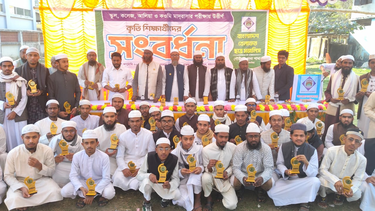 বাংলাদেশ খেলাফত ছাত্র মজলিস ময়মনসিংহের গৌরীপুর উপজেলা শাখার উদ্যোগে বুধবার (২৮ জানুয়ারি/২৬) স্কুল, কলেজ, আলিয়া ও কওমি মাদরাসার কৃতি শিক্ষার্থীদের ঐতিহাসিক শহিদ হারুন পার্কে সংবর্ধনার আয়োজন করে। অনুষ্ঠানের প্রধান অতিথির বক্তব্য রাখেন ১০দলীয় জোটের ময়মনসিংহ-৩ গৌরীপুর আসনের বই প্রতীকের প্রার্থী মাওলানা আবু তাহের খান।