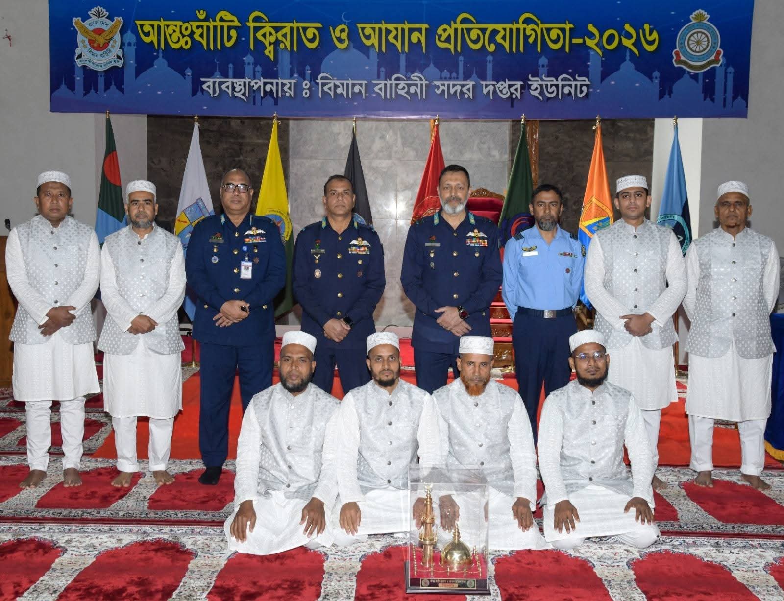 বাংলাদেশ বিমান বাহিনীর আন্তঃঘাঁটি ক্বিরাত ও আযান প্রতিযোগিতা-২০২৬ ঢাকায় অবস্থিত বিমান বাহিনী ঘাঁটি বাশার এর শাহীন মসজিদে ১৭ ফেব্রুয়ারি ২০২৬ তারিখ, মঙ্গলবার সমাপ্ত হয়।