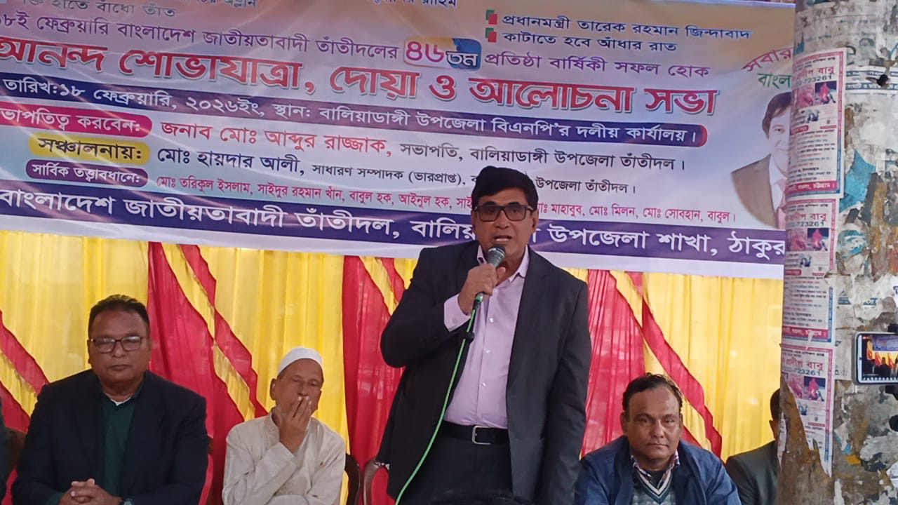 দেশনেত্রী বেগম খালেদা জিয়া চির অম্লান শক্ত হাতে বাঁধো তাঁত প্রধানমন্ত্রী তারেক রহমান জিন্দাবাদ কাটতে হবে আঁধার রাত এই স্লোগানকে সামনে রেখে বালিয়াডাঙ্গী উপজেলা তাঁতীদলের ৪৬ তম প্রতিষ্ঠা বার্ষিকী উপলক্ষে আনন্দ শোভাযাত্রা দোয়া ও আলোচনা সভা অনুষ্ঠিত হয়েছে