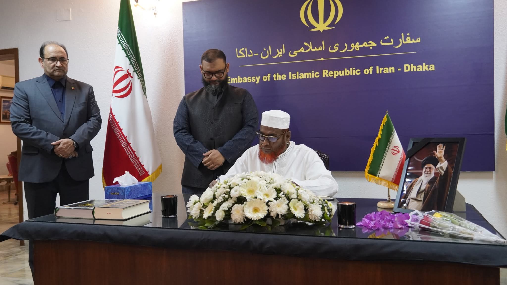শহীদ আয়াতুল্লাহ আলী খামেনী (রহ.) এর প্রতি সম্মান জানিয়ে ঢাকাস্থ ইরান এম্বাসির শোক বইতে সেক্রেটারি জেনারেল এর স্বাক্ষর