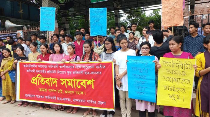 ড. মুহাম্মদ ইউনুসের নেতৃত্বে গঠিত অন্র্Íবর্তীকালীন সরকারের আলোচনা ব্যতীত আদিবাসী জনগোষ্ঠীর প্রতিনিধি নিয়োগ করায় প্রতিবাদ সমাবেশ করেছে বাংলাদেশ সচেতন আদিবাসী ছাত্র-জনতা। মঙ্গলবার (১৩ আগস্ট) সকালে বান্দরবান মুক্তমঞ্চে তারা এ প্রতিবাদ