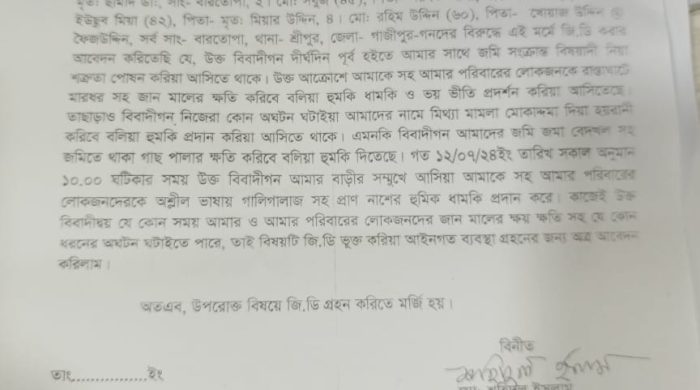 এই ঘটনায় অসহায়,,,,,, নিজের নিরাপত্তা চেয়ে গত ১৫ জুলাই শ্রীপুর মডেল থানায় একটি জিডি করার সাধারণ অভিযোগ করেছেন। জানা গেছে, শ্রীপুর উপজেলার মাওনা ইউনিয়নের বারতোপা গ্রামের মৃত আঃ মজিদ read more
