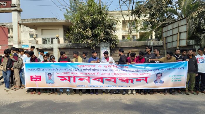 পিরোজপুর কারিগরি প্রশিক্ষণ কেন্দ্রের (টিটিসি) দুই প্রশিক্ষকের বিরুদ্ধে ঘুষ, অনিয়ম ও দুর্নীতির অভিযোগ তুলে মানববন্ধন কর্মসূচি পালন করেছে স্থানীয় জনগণ। রোববার (১৮ জানুয়ারি) সকালে টিটিসি চত্বরে ‘পিরোজপুরের সর্বস্তরের জনগণ’-এর ব্যানারে
