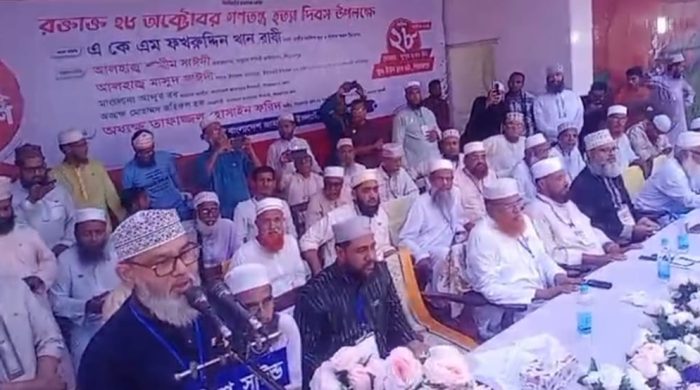 পিরোজপুর গণতন্ত্র হত্যা দিবস উপলক্ষে অনুষ্ঠিত এক সমাবেশে বাংলাদেশ জামায়াতে ইসলামী নেতা ও ইন্দুরকানী উপজেলার সাবেক চেয়ারম্যান আলহাজ্ব মাসুদ সাঈদী সাবেক প্রধানমন্ত্রী শেখ হাসিনা লক্ষ্য করে বলছেন দিল্লির গোলাম দিল্লিতে